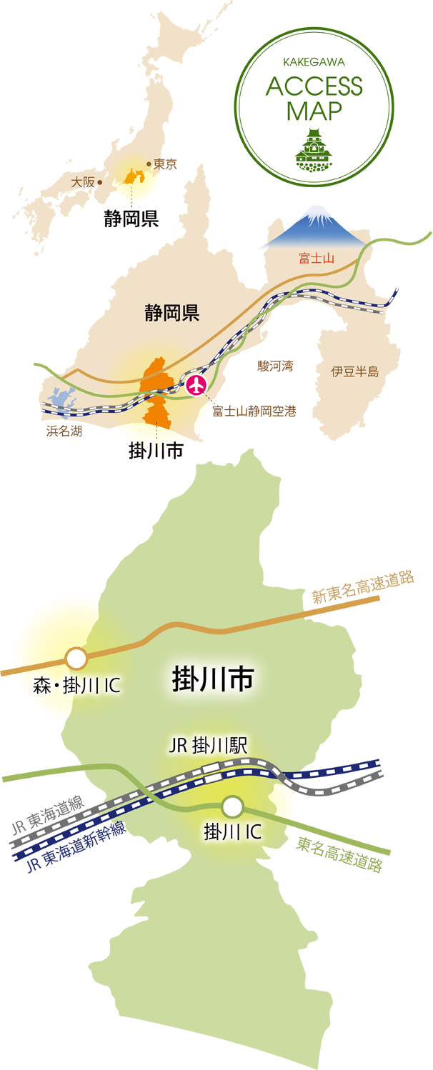 掛川市は、日本のほぼ中央に位置し、南は太平洋に面した、温暖な気候と豊かな自然環境に恵まれた街です。