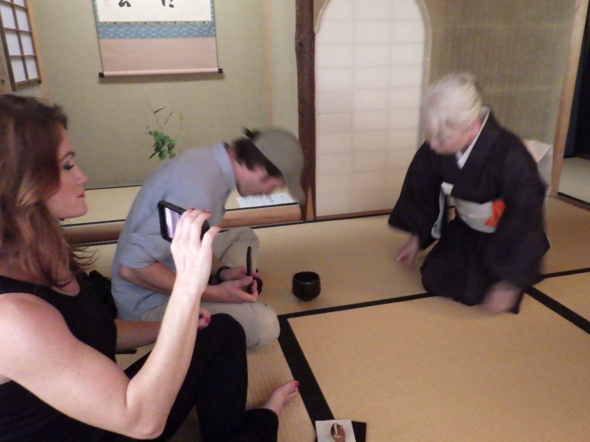 場所を小間に移して抹茶による点茶体験。茶室の中ではどんな身分の人でも平等な立場になることや、茶室の狭さの意味など、茶室にまつわる様々なことを学んでいただきました。